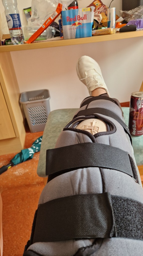 Nach dem Besuch beim Physio durften wir dann die Orthese auf 60 Grad stellen. Das fühlt sich deutlich besser und natürlicher an als die vorherigen 30 Grad.